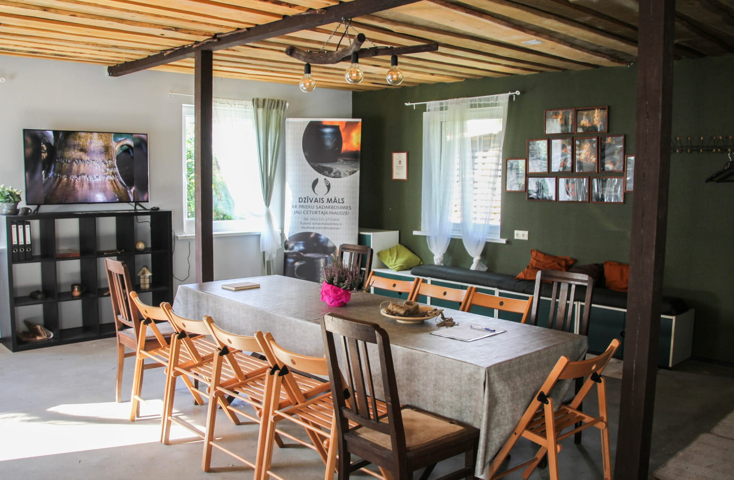 Vēja zvanu pīšana, darbs ar angobām vai akrila krāsām uz izdedzināta māla, bļodu un citu trauciņi lipināšana. Svini svētkus pie mums - dzimšanas dienas, vecmeitu ballītes un draudzīgas sanākšanas ar radošu izklaidi. Pieejamas labiekārtotas teplas, nojume un bērnu laukums. Cena no 10-20 €/persona.