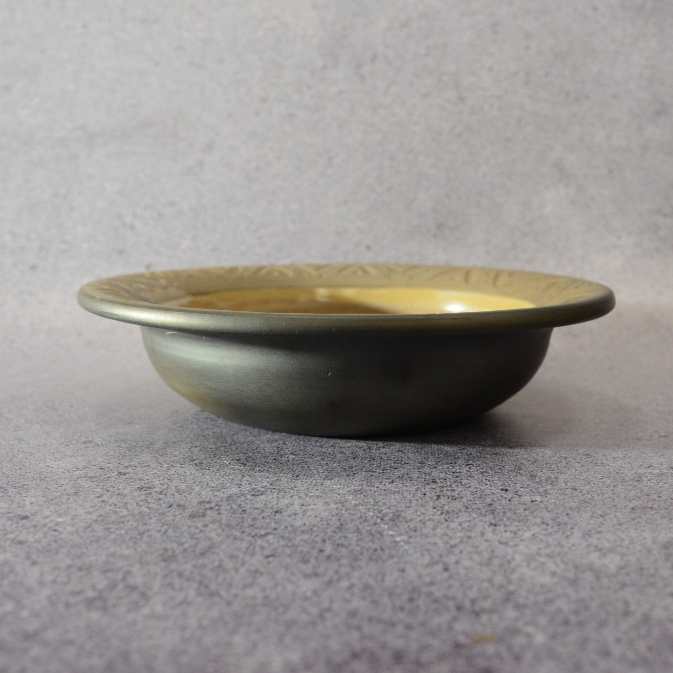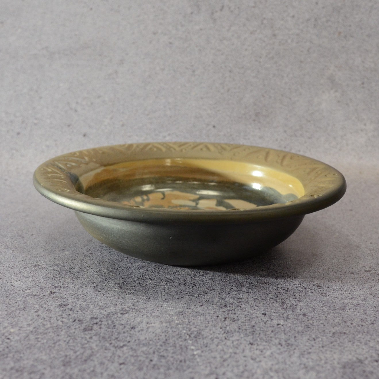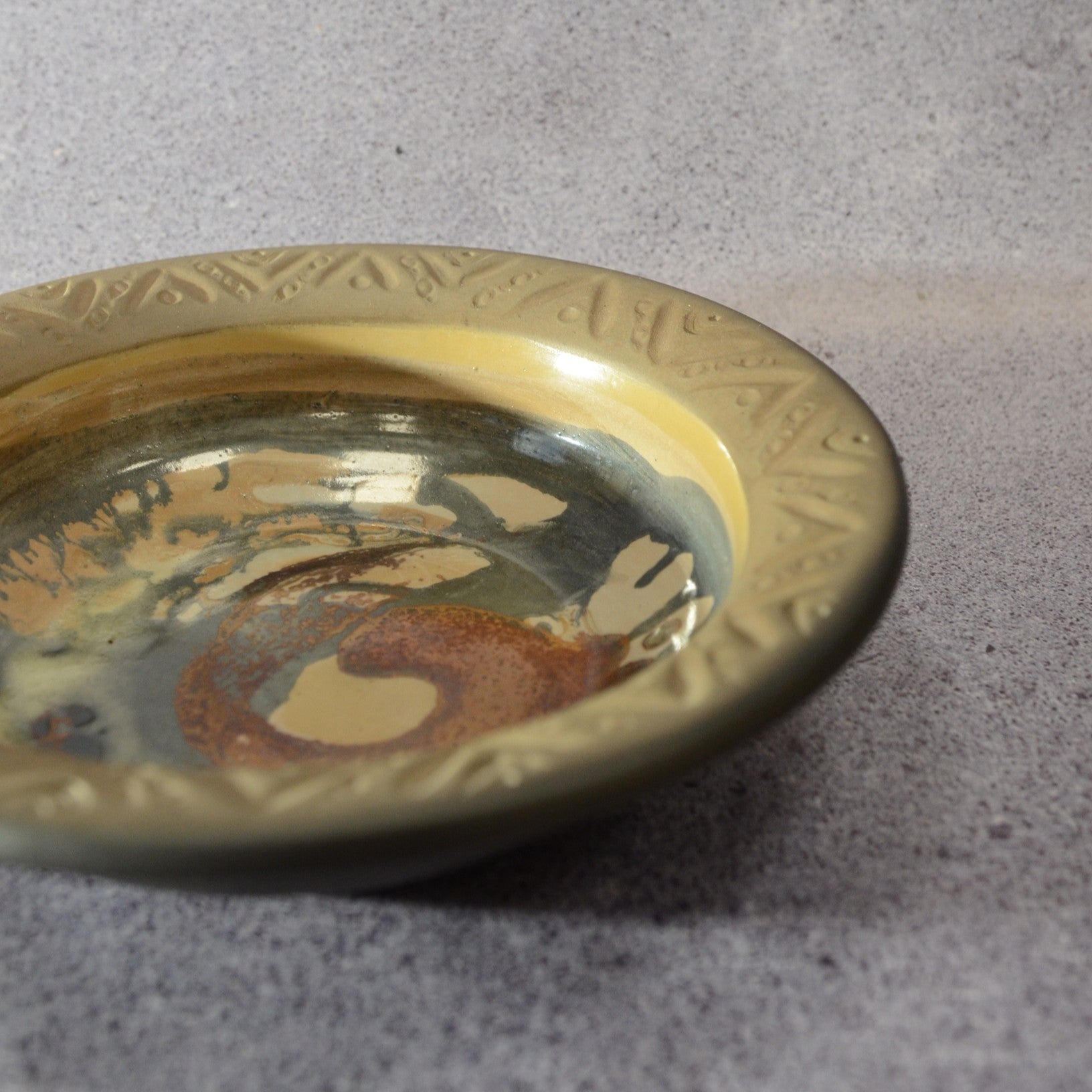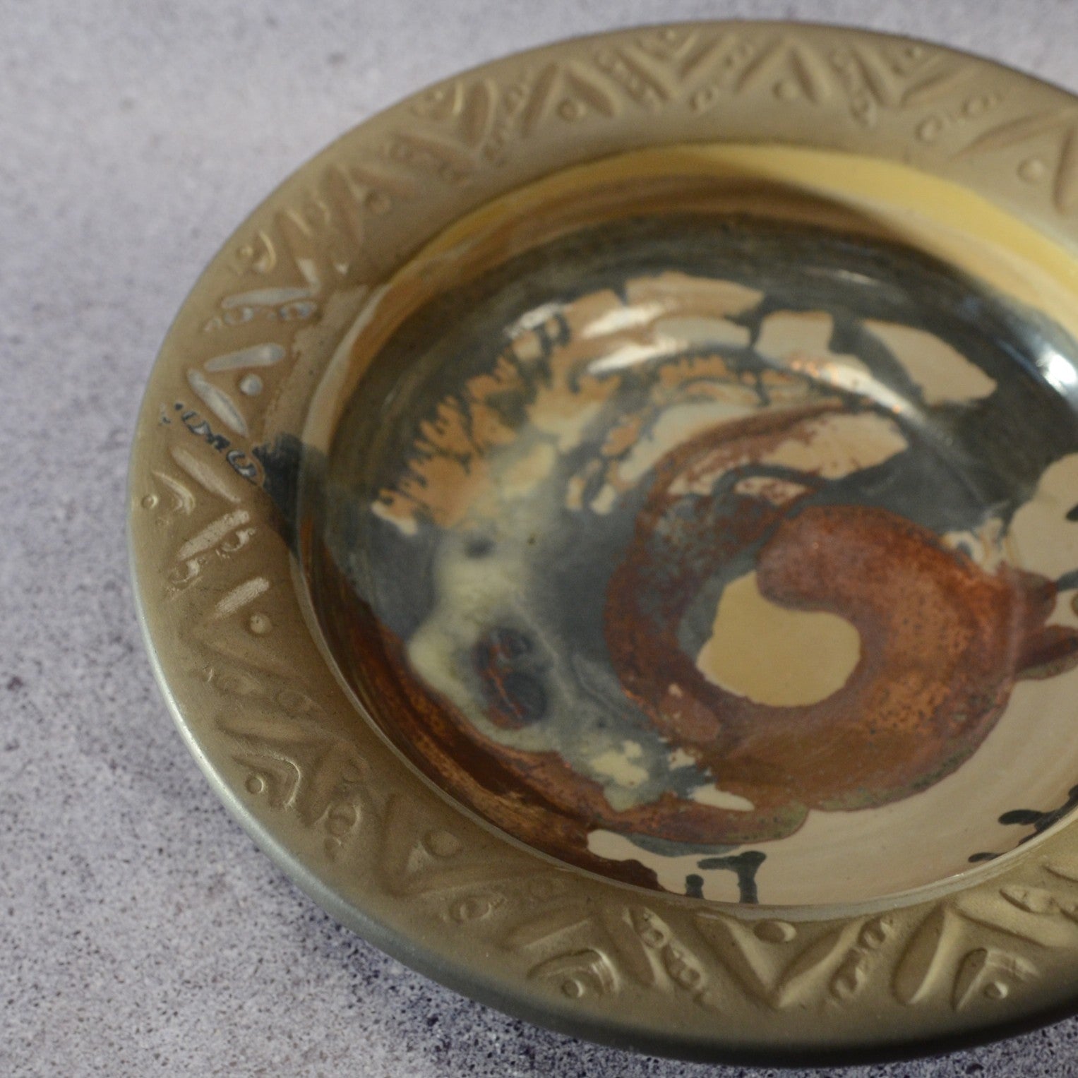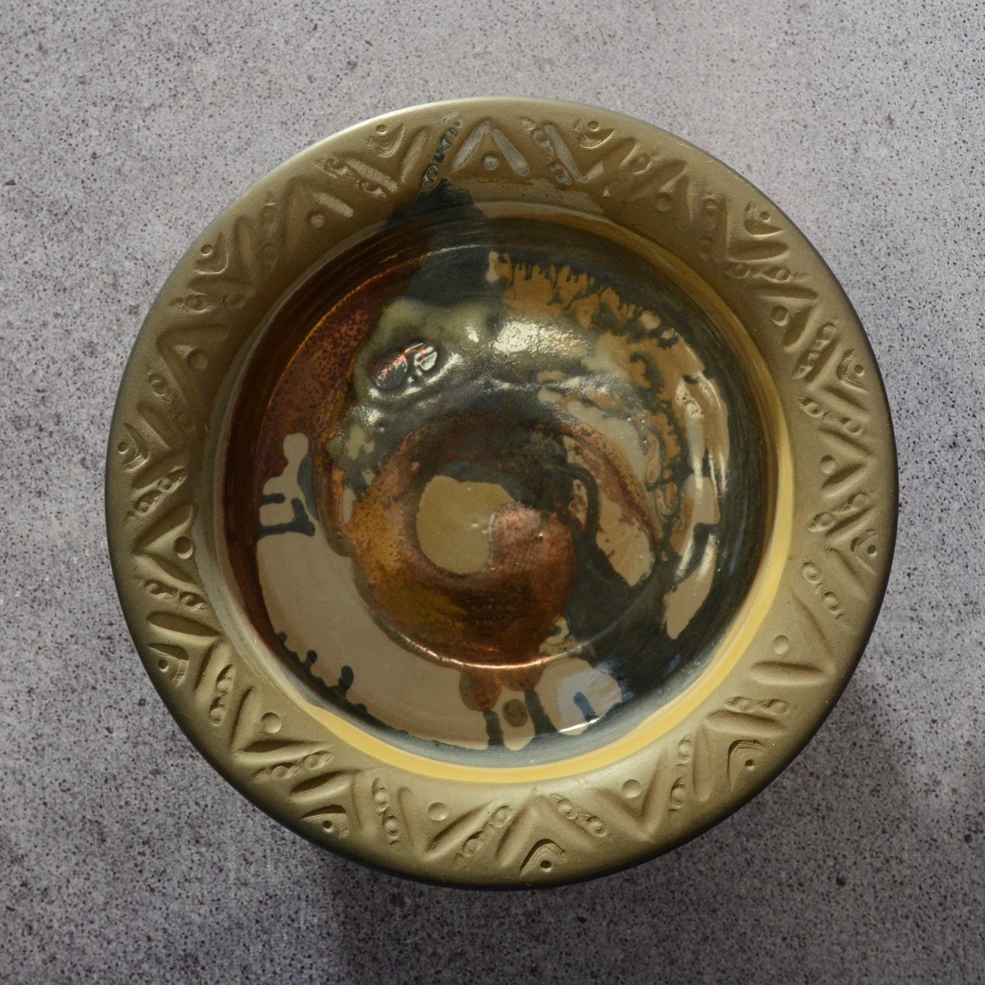 Svēpētā keramika, glazūra. Diametrs 26,5 (ārējais) un 20(iekšējais) cm, augstums 6,5 cm.